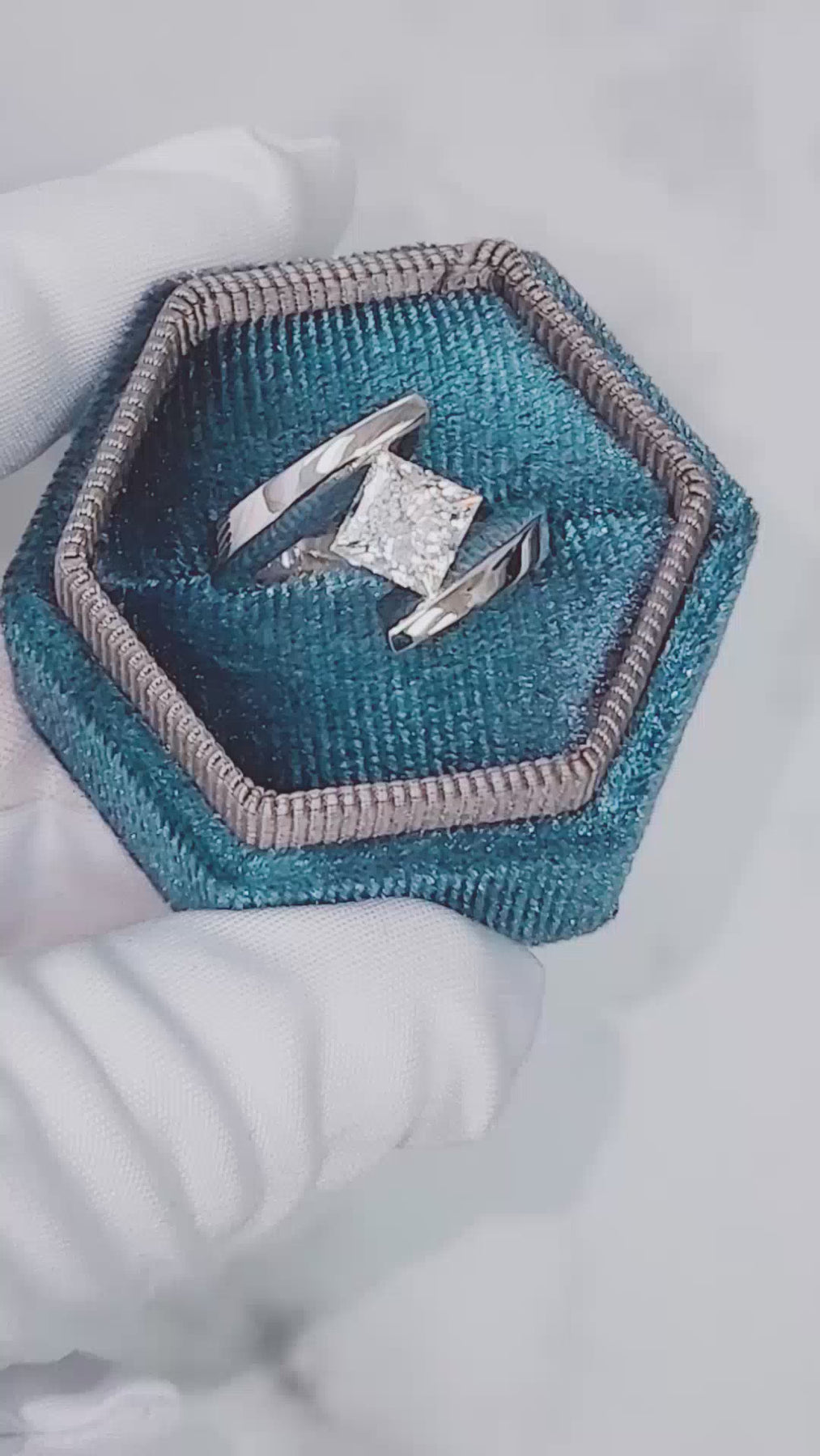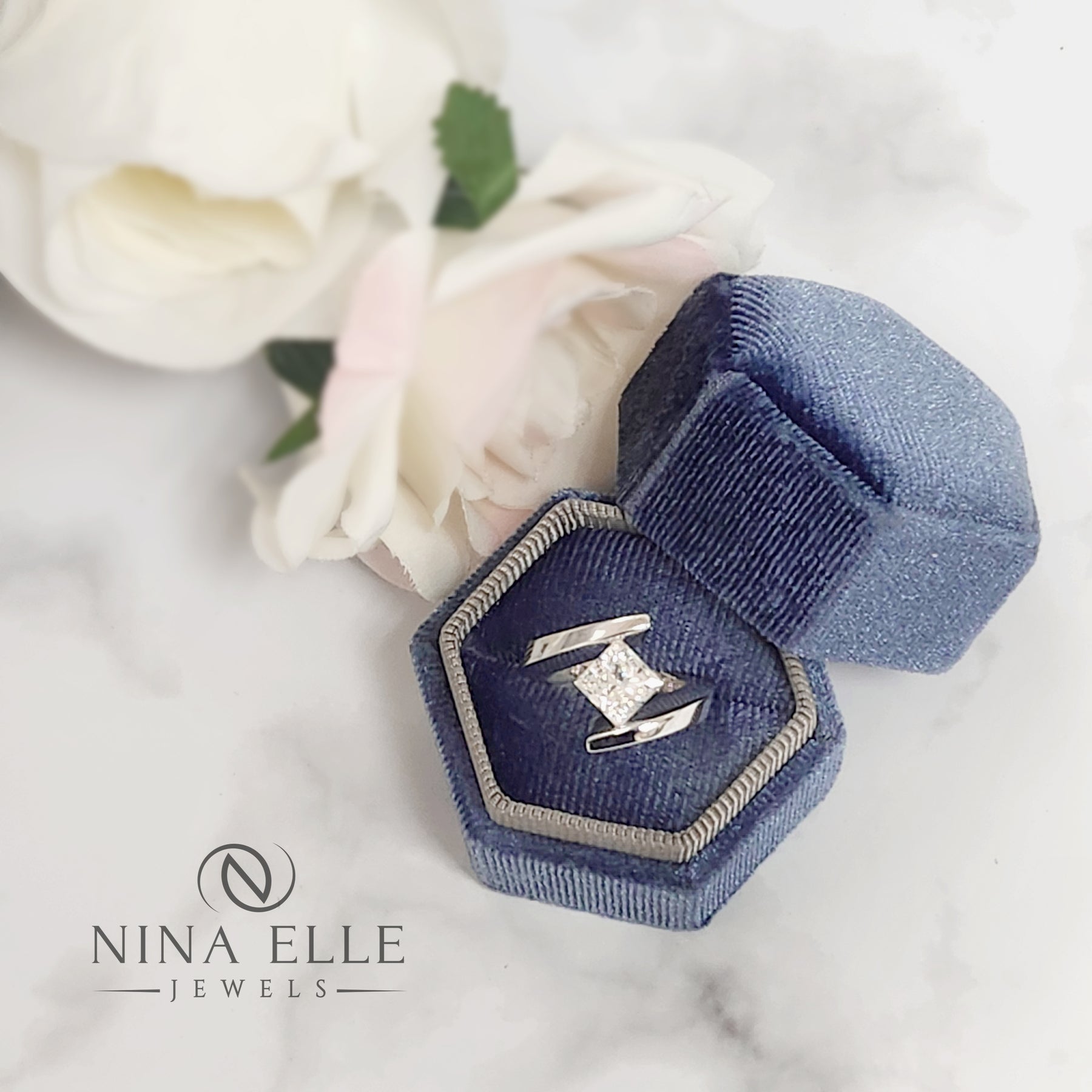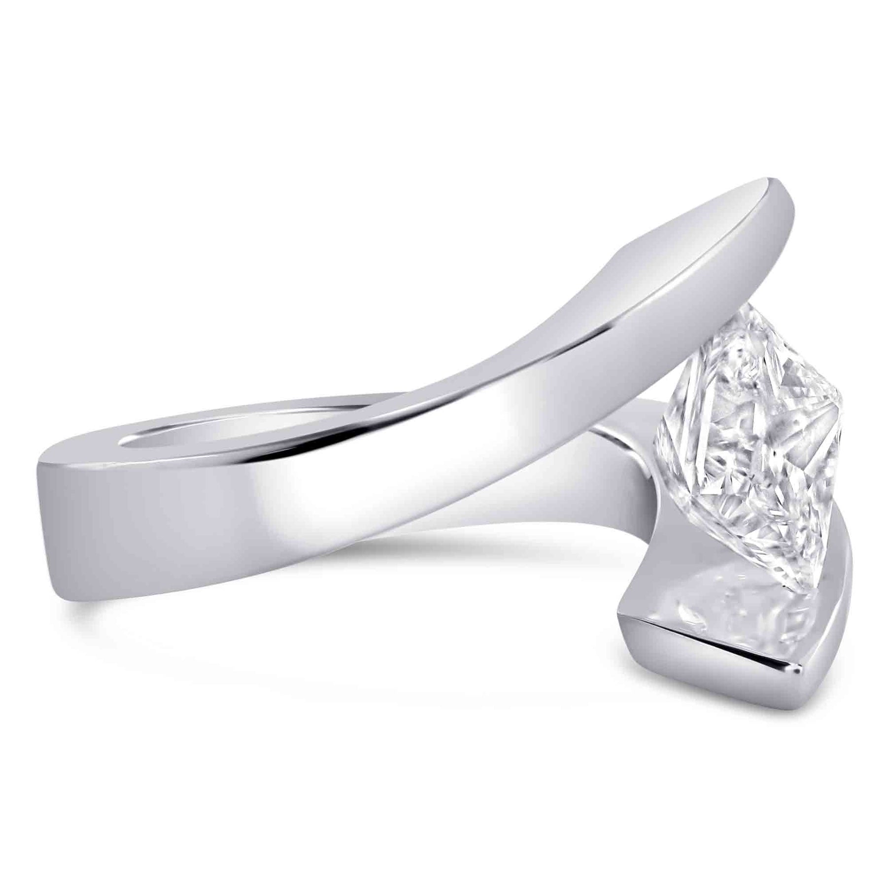 A square princess cut white and clean diamond is set on a bias in this unique tension set solitaire mounting. Also available with matching wedding band.