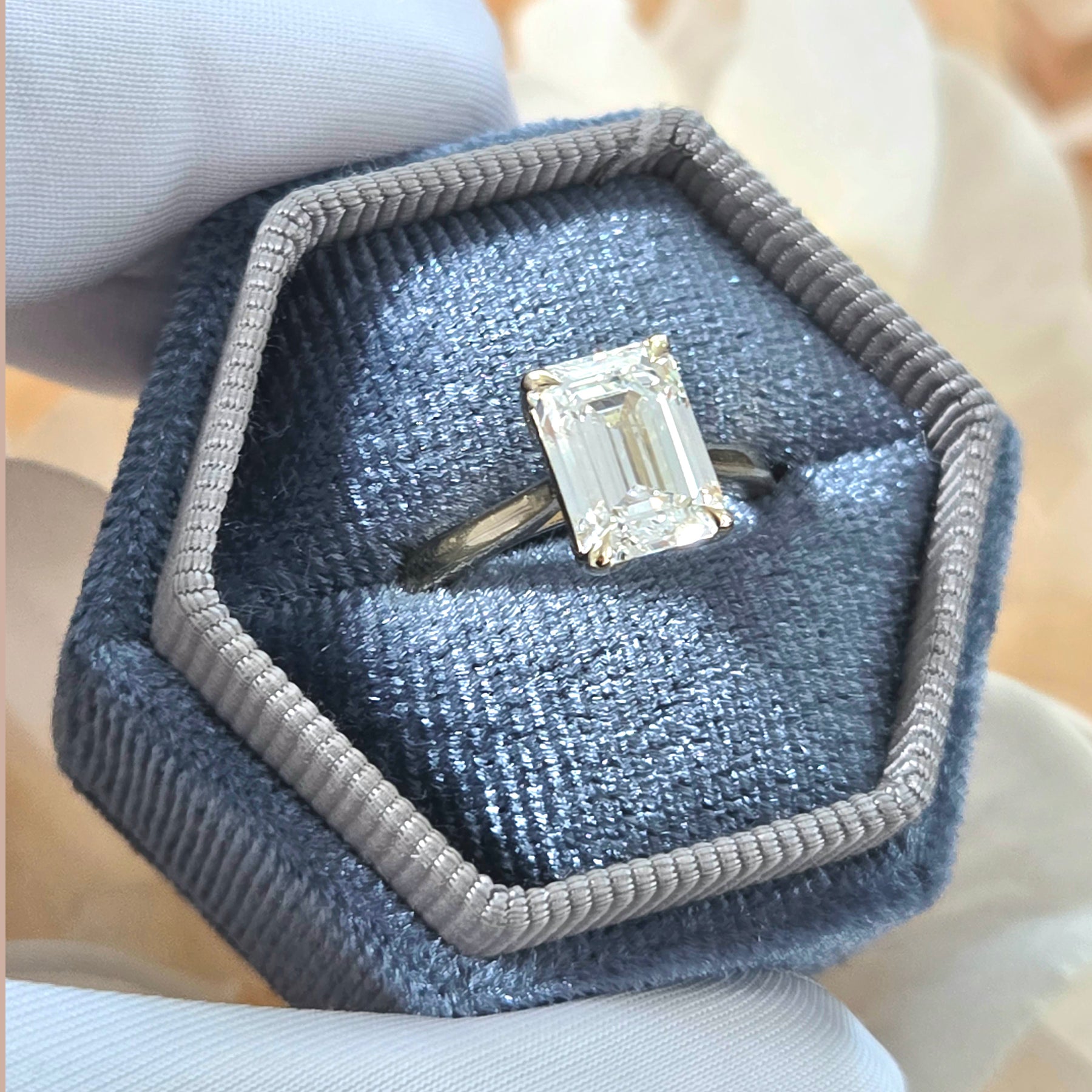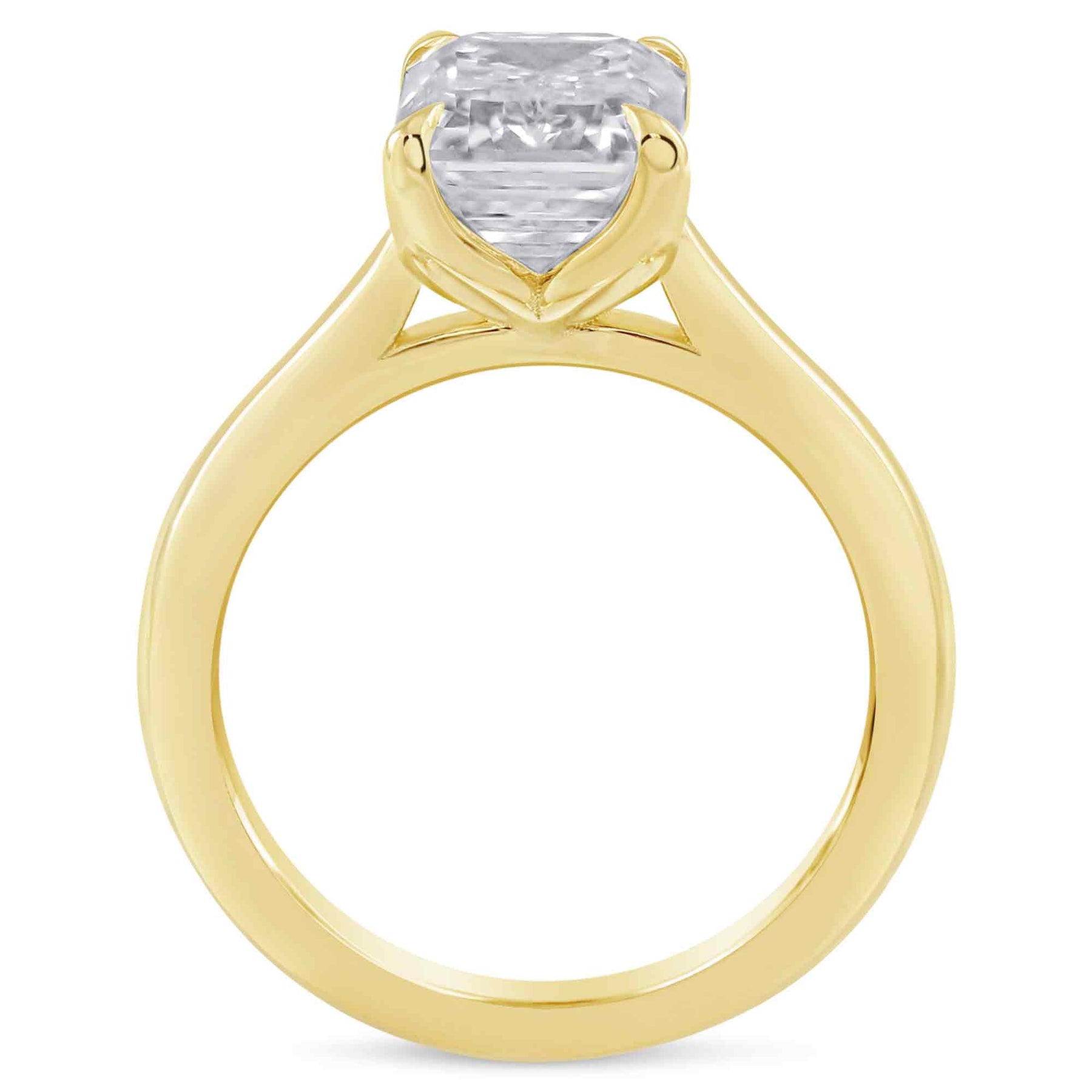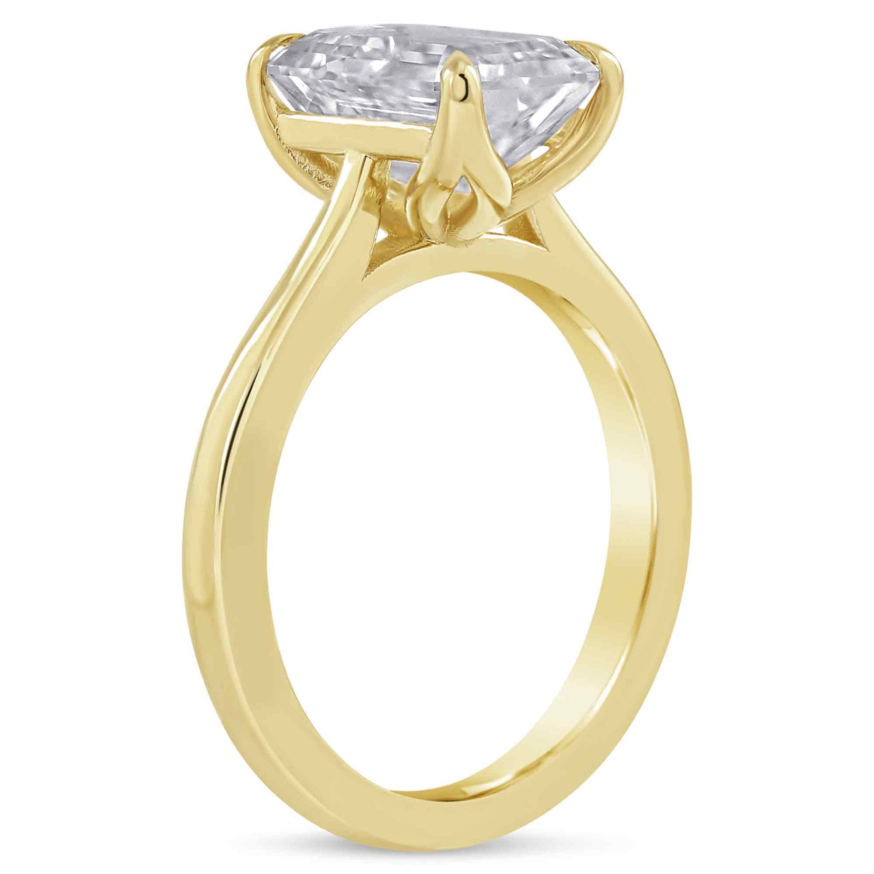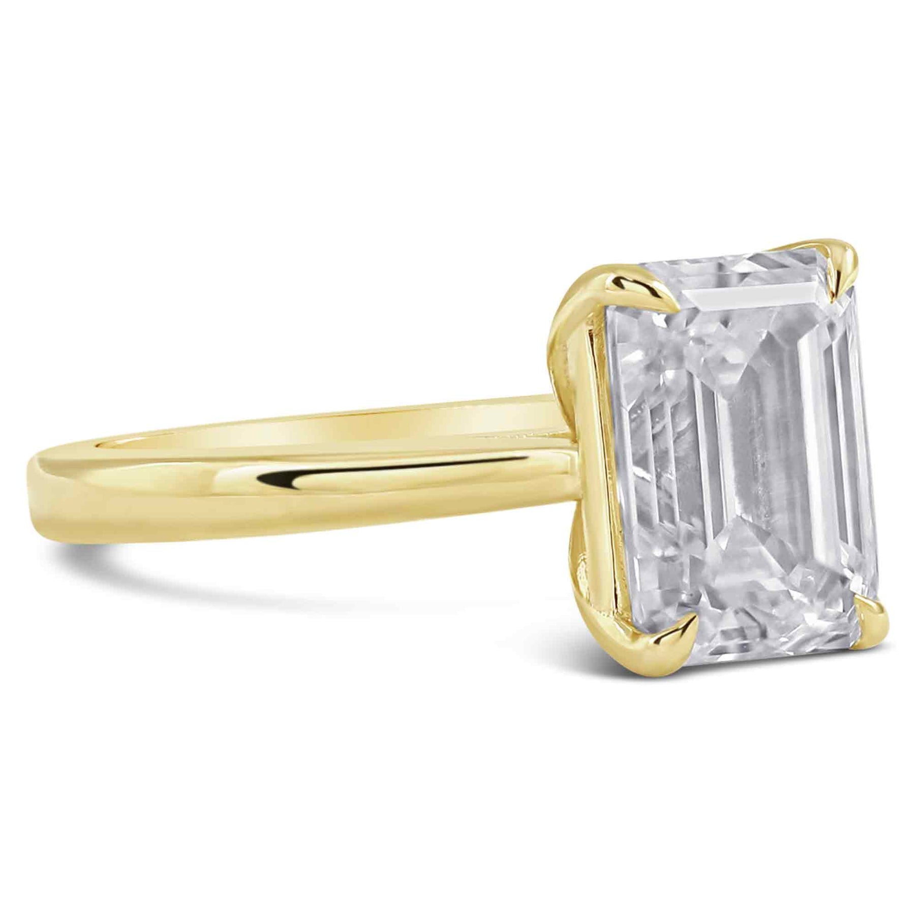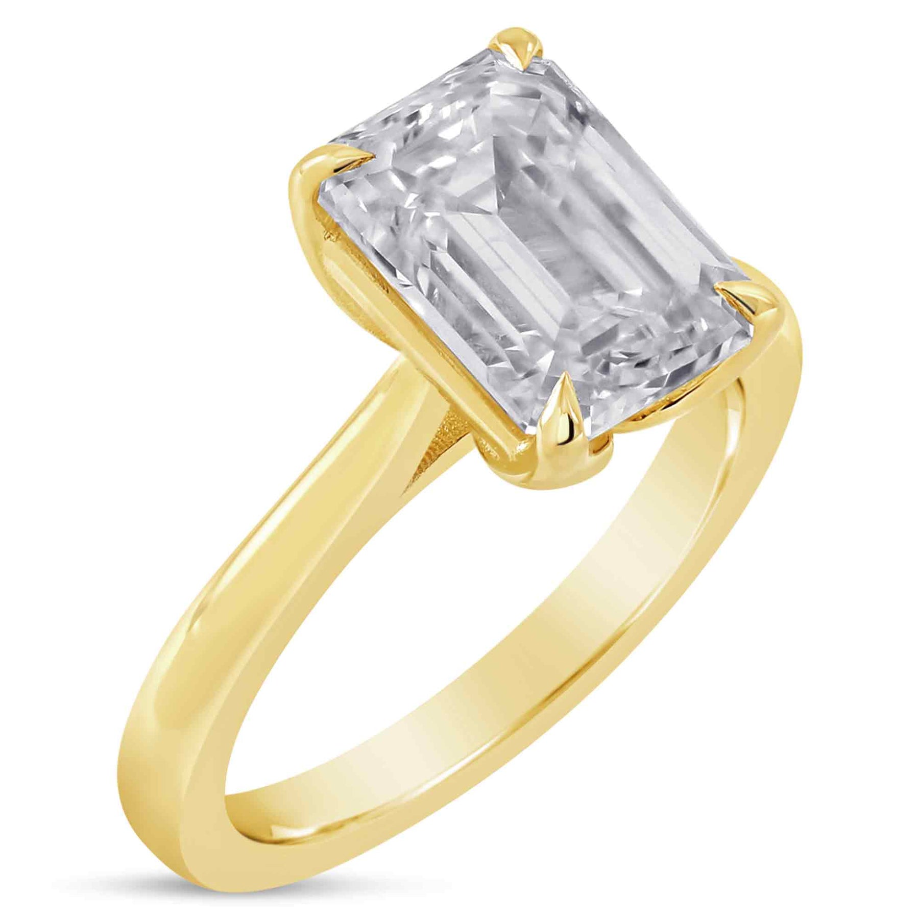 A 3ct F VS2 lab-grown emerald-cut diamond shines at the center of this timeless engagement ring. Set in a sleek four-prong eagle claw and crafted in solid 14k yellow gold, it’s a perfect blend of classic design and modern brilliance. The softly rounded shank adds comfort to its sophisticated silhouette — a ring that’s both striking and enduring.