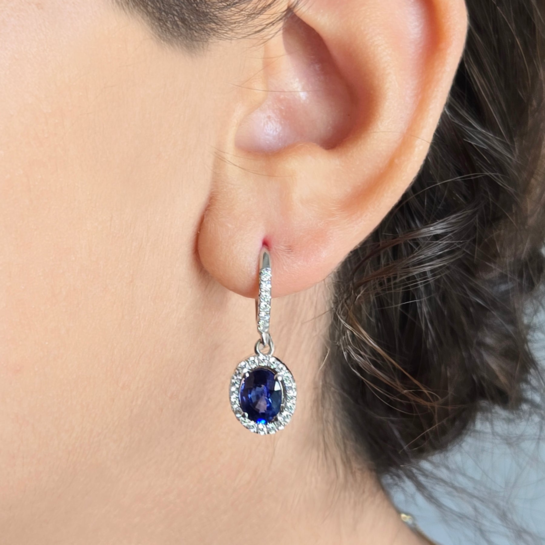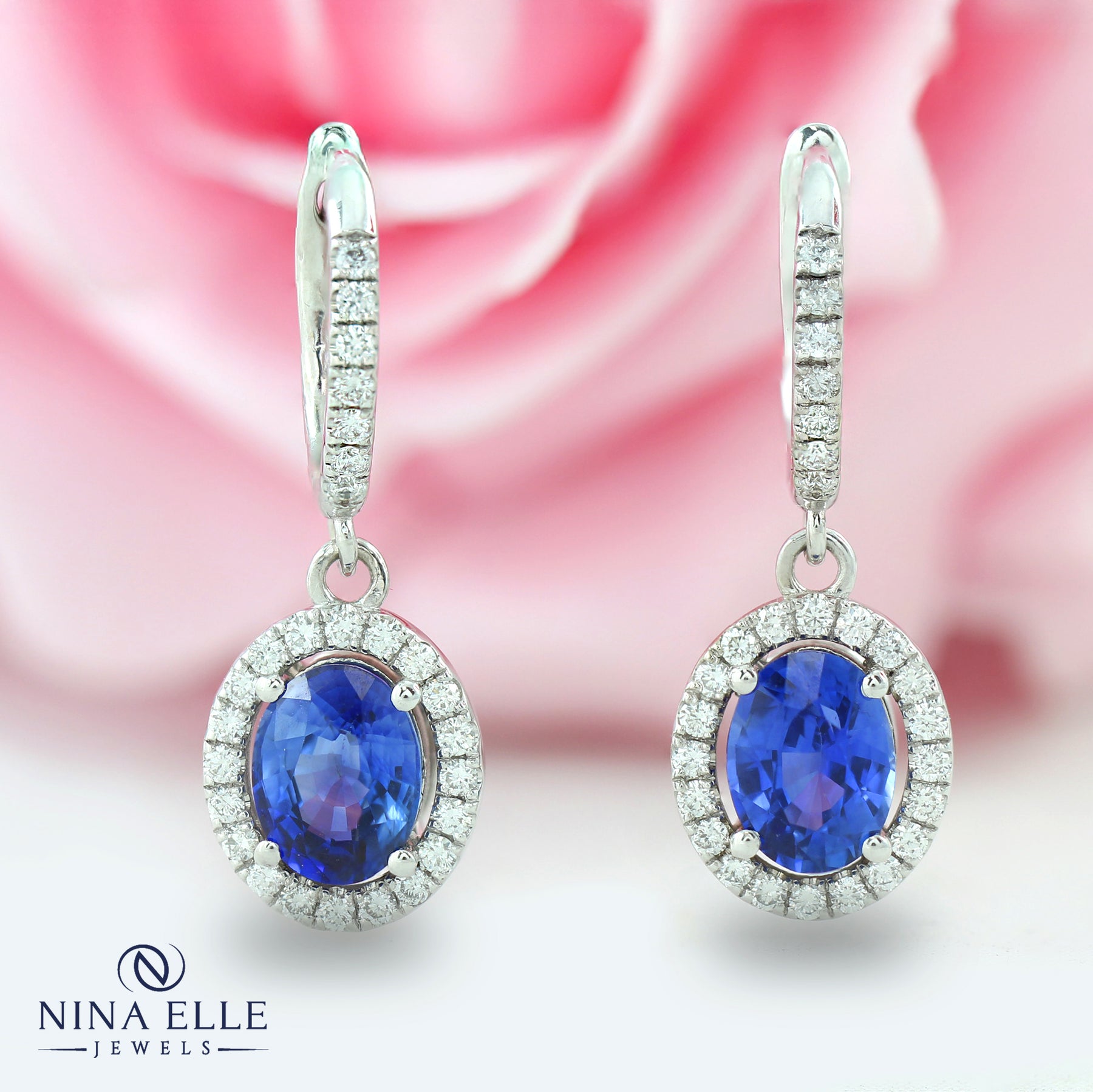 The perfect pair of drop down earrings to dress up any outfit, these sparkling 5ctw natural sapphire and diamond earrings feature a 2ct oval shape sapphire on each side complimented by white sparkling round cut diamonds.