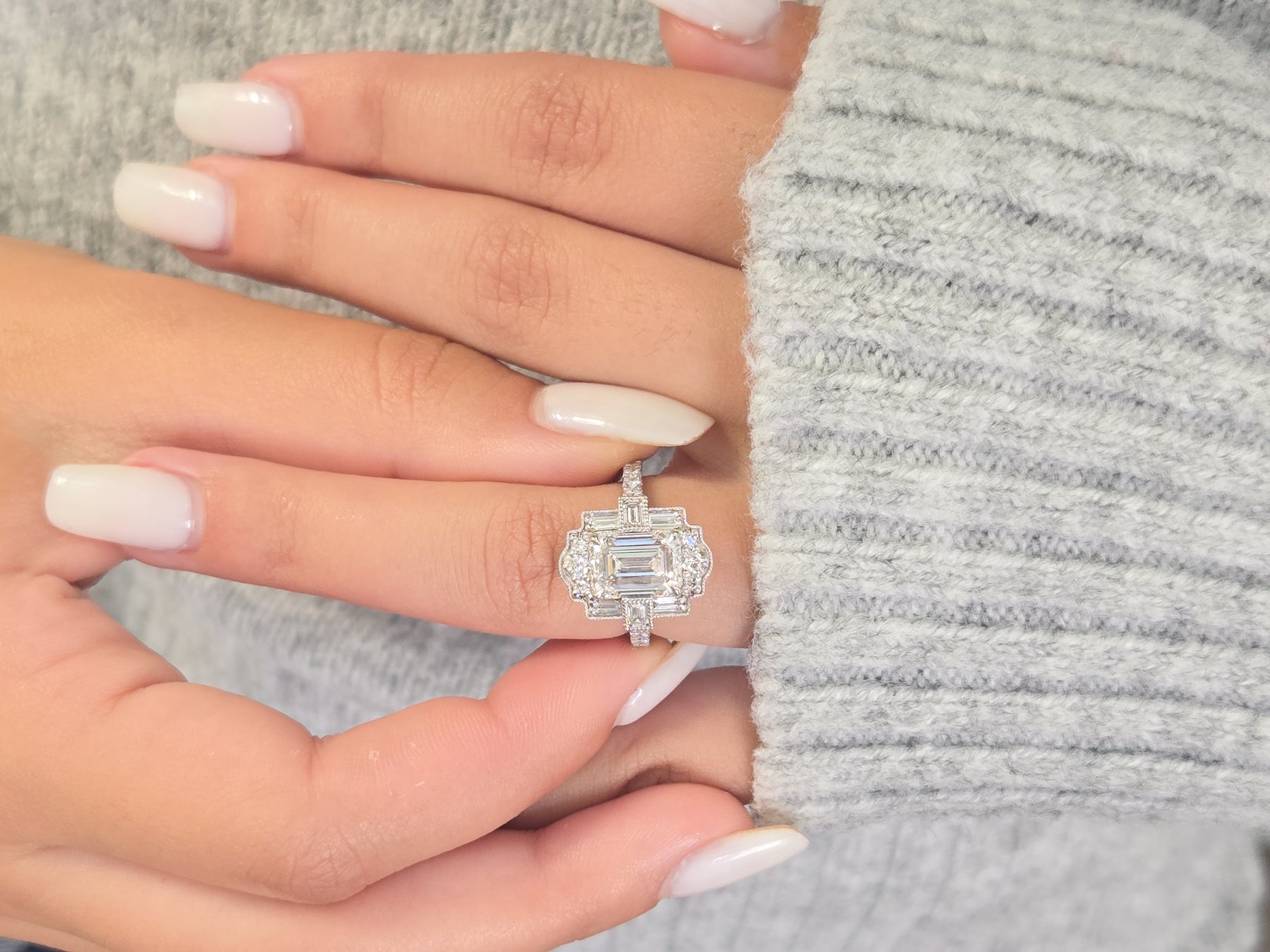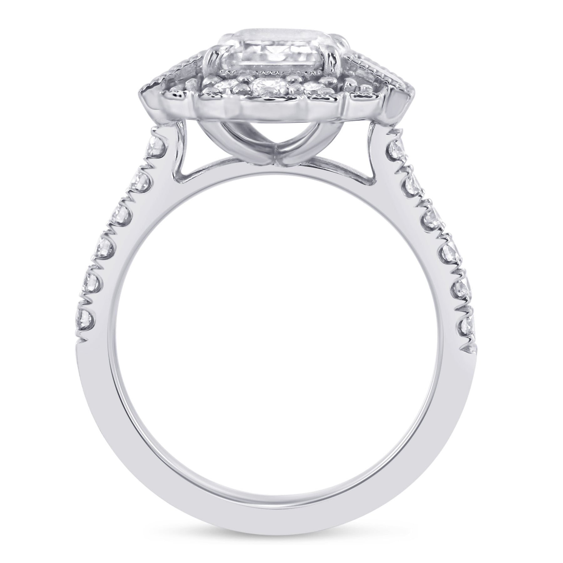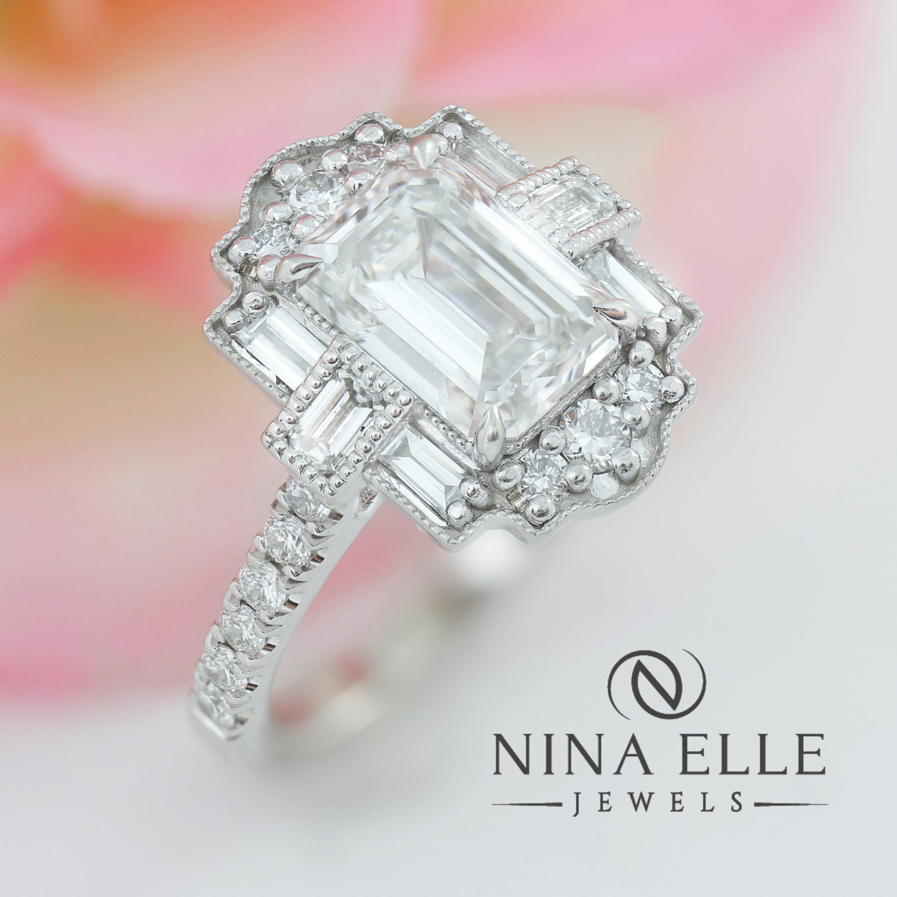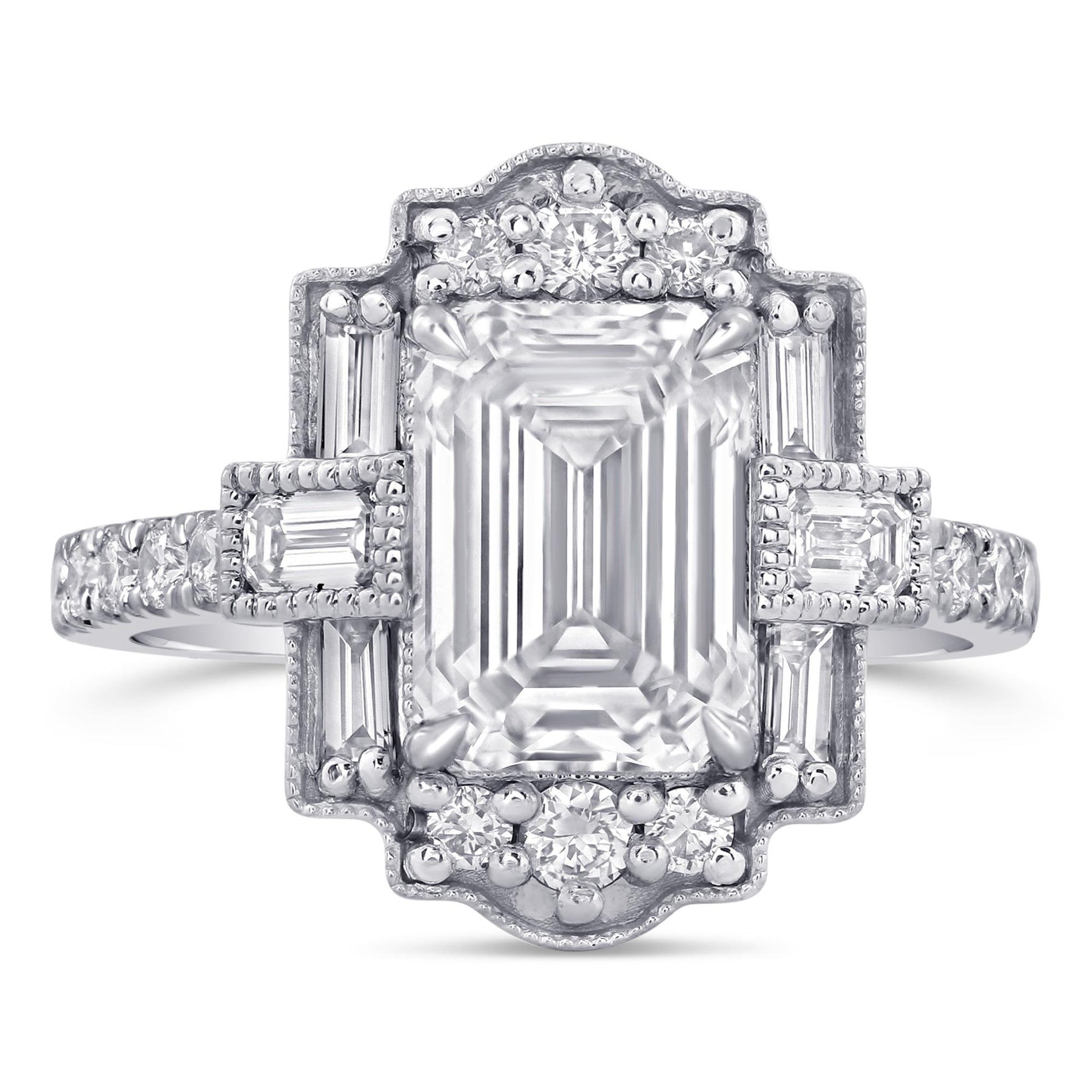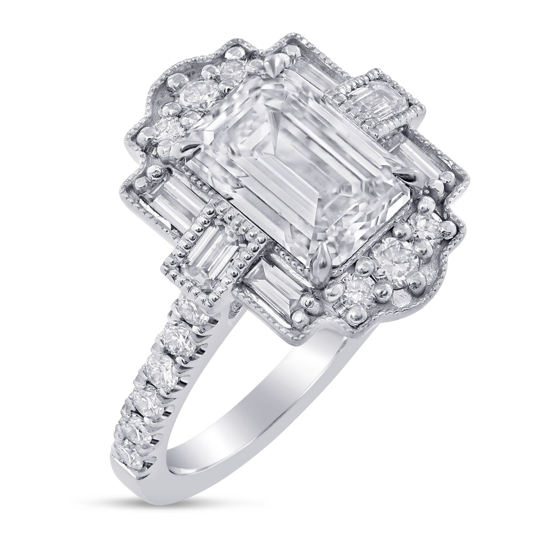 3ctw Antique Halo Emerald Cut Diamond Ring with Baguette Accents