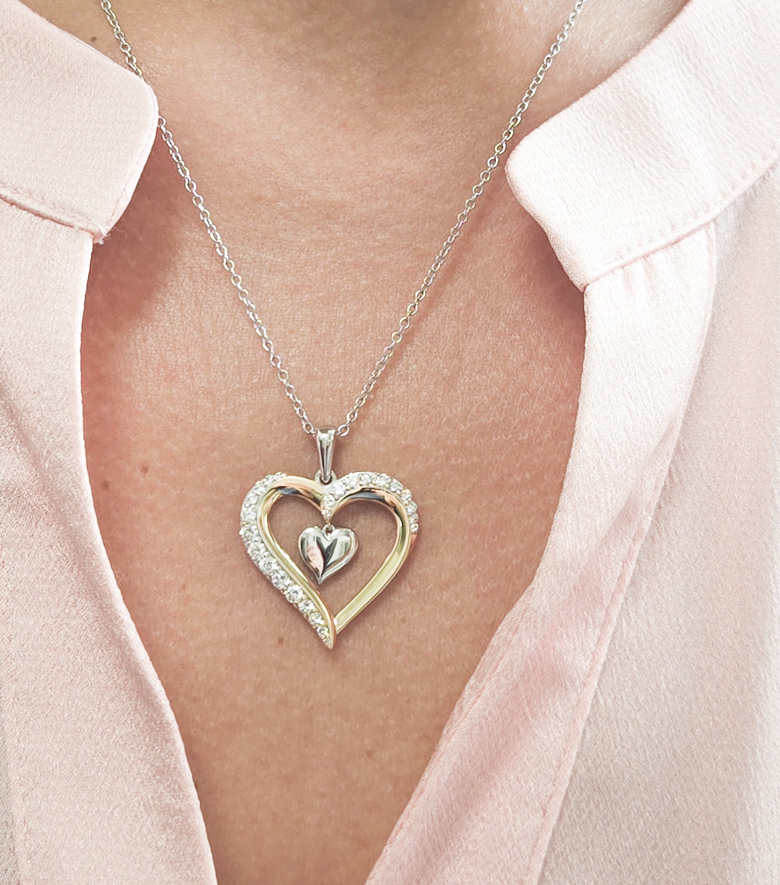 A symbol of love beautifully captured in gold and diamonds. This two-tone heart necklace features a larger heart outlined in shimmering pavé-set diamonds, embracing a smaller polished solid white gold heart within. The dual-heart design represents the deep bond between two souls—perfect for expressing love, affection, and connection. Elegant and timeless, this piece makes a meaningful gift for someone who holds your heart.